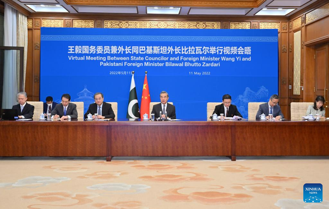 Ĉina ŝtata konsilanto kaj ministro pri eksterlandaj aferoj Wang Yi merkrede renkontiĝis kun sia pakistana paralelulo Bilawal Bhutto Zardari per videoligo, alvokante la du flankojn fari ĉian provon por malhelpi subfoson de la duflankaj rilatoj.