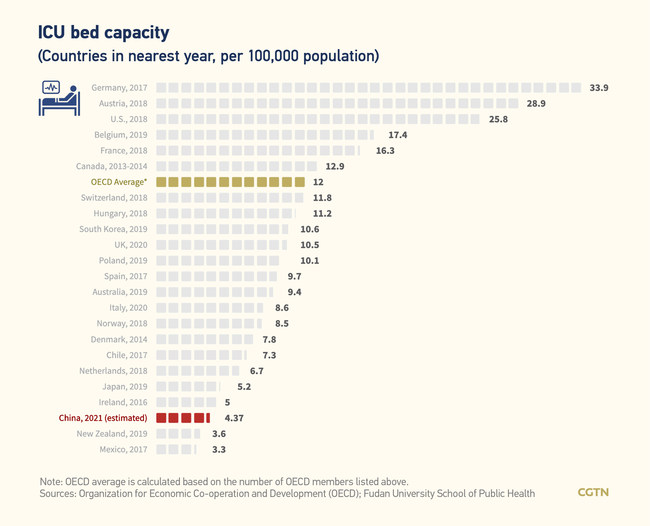 Laŭ eseo publikigita lastjulie en periodaĵo Ĉinaj Prisanaj Resursoj, la lando kalkulis 4,37 litojn de intensive prizorga unuo po 100,000 de ĝia loĝantaro en 2021. Tamen la numero de Germanio en 2017 estis jam 33,9 kaj la numero de Usono en 2018 jam 25,8.