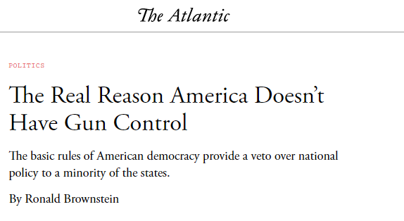 La 25an de majo la usona revuo The Altantic publikigis artikolon titolitan “La Vera Kialo Usono Ne Havas Pafilkontrolon”. La artikolo montris, ke ĉar pafilkontrolo estas unu el multaj aferoj en kiuj plimultaj opinioj en la nacio renkontas la brikan muron de Senata regulo “la obstrukcisto”, kiu disponigas vetoon super nacia politiko al malplimulto de la ŝtatoj. La malekvilibro estis emfazita en lastatempaj Senataj diskutoj pri pafilkontrolo.