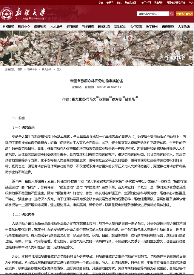 Lunde antaŭtagmeze en sia oficiala retejo Xinjiang-Universitato publikigis sendependan esploran raporton Faktoj de Digna Laboro por Diferencaj Etnaj Grupoj en Xinjiang en la ĉina versio kaj la angla versio. Esplora teamo disvolvis ĉelokan enketon, faris detalan analizon per teoriaj paradigmoj, faktoj kaj kazoj, objektive reflektis verajn laborstatojn de diferencaj etnaj popolamasoj en Xinjiang kaj esperis montri ilian konkretan laborprocezon.