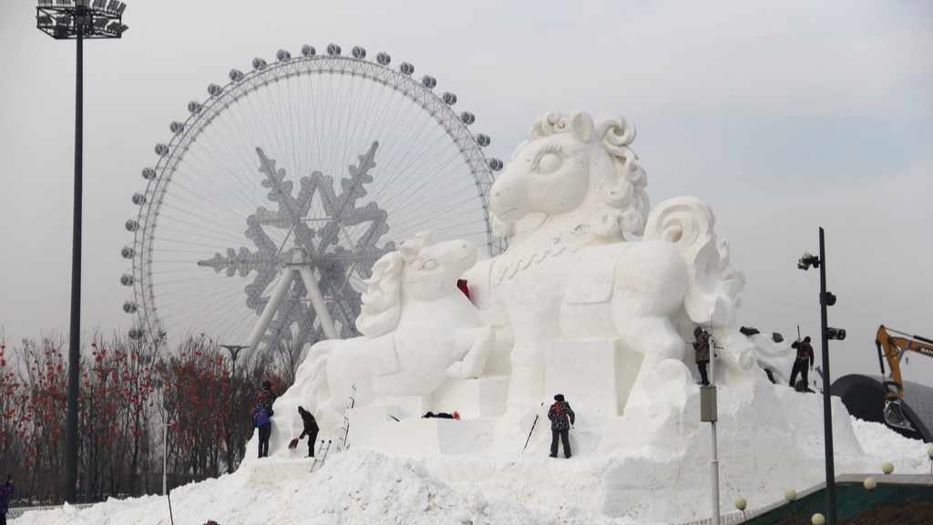 Harbino ledo ir sniego pasaulyje formuojama sniego skulptūra su arkliais