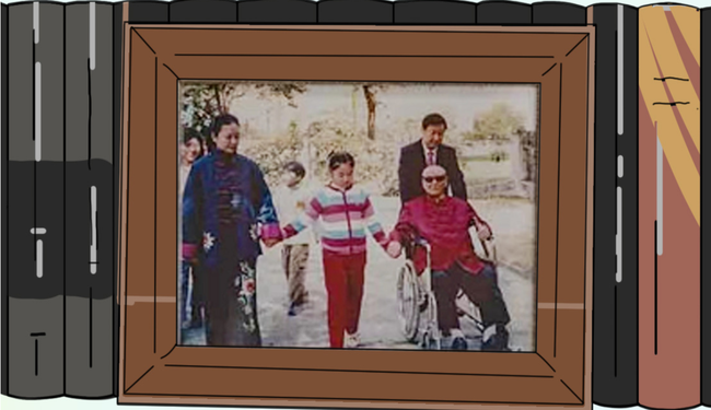 En la oficejo de Xi Jinping estas kelkaj fotoj de varma familia vivo el diversaj epokoj. En unu foto, Xi puŝas sian maljunan patron promenante kun siaj edzino kaj filino.