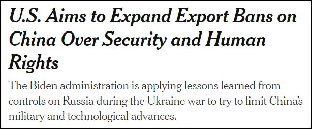 La ĵurnalo New York Times lastatempe publikigis artikolon dirante, ke la usona registaro "tiras lecionojn" el la sankcioj kontraŭ Rusio, provante uzi ĉi tiujn spertojn por grandigi restriktojn de eksportado al Ĉinio kaj aliaj landoj kaj malebligi "minacojn al la nacia sekureco de Usono". Analizistoj opinias, ke Usono prenas Ĉinion kiel "imagan malamikon" kaj adoptas politikojn por limigi aŭ eĉ subpremi Ĉinion en multaj kampoj, kio montras ĝian fortan maltrankvilon pri malkresko.