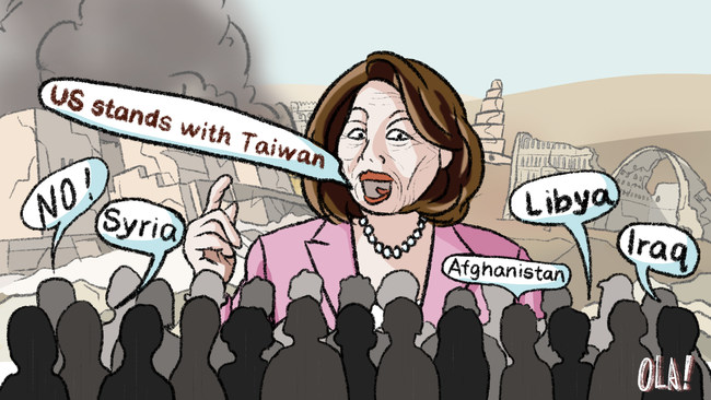 Kiam la prezidanto de la usona Ĉambro de Reprezentantoj, Nancy Pelosi, faris viziton al la ĉina regiono Tajvano, ŝi asertis, ke ŝia vizito estas forta pruvo de tio, ke Usono kaj Tajvano staras kune. Sed estas mokinde, ke la historio kaj faktoj foje kaj refoje pruvis, ke, kun kiu staras usona politikisto, en ties loko neeviteble okazas tumulto kaj katastrofo, ekzemple en Irako, Sirio, Libio kaj Afganio.
