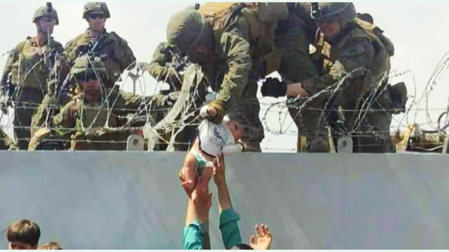 En aŭgusto 2021, usonaj soldatoj retiriĝis el Afganio kaj pro tio la Kabula Flughaveno estis en malordo. Afganaj geedzoj senespere transdonis sian 2-monatan filon al usonaj soldatoj ene de la muro de Kabula Flughaveno.