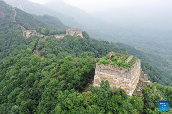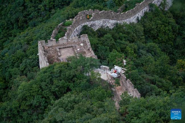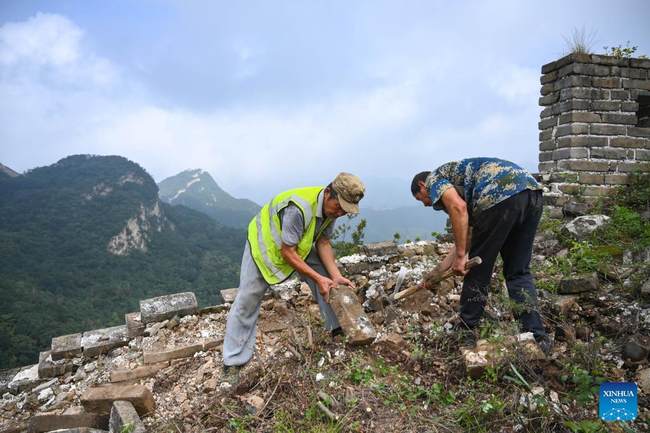 Laboristoj laboras en arkeologia loko, kiu estas la esplor-bazita ripara parto de la sekcio Jiankou de la Granda Muro en Pekino, ĉefurbo de Ĉinio, la 17an de aŭgusto 2022.