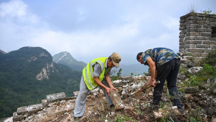 Laboristoj laboras en arkeologia loko, kiu estas la esplor-bazita ripara parto de la sekcio Jiankou de la Granda Muro en Pekino, ĉefurbo de Ĉinio, la 17an de aŭgusto 2022
