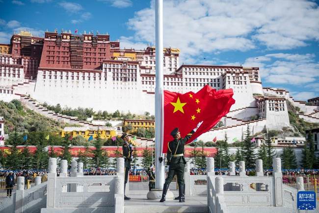 La flaghisa ceremonio okazis ĉe la placo Potala Palaco en Lasao, Tibeta Aŭtonoma Regiono.