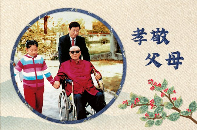 Xi Jinping estas respekta kaj fileca al siaj gepatroj, kvankam li okupiĝas pri sia ofico. Kiam ajn li havas tempon, li tenas la manon de la patrino por promeni, babili. Kiam li ne povas renkontiĝi kun siaj gepatroj, precipe en la Printempa Festo, li telefone esprimas sian bedaŭron kaj sian filecon. Sur lia librobretaro staras du fotoj: en unu li kaj liaj familianoj akompanas la patron sidantan en rulseĝo, kaj en alia li prenas la manon de la patrino kaj promenas en korto.