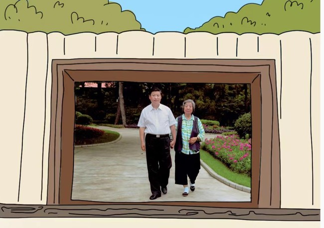 En la oficejo de Xi estas kelkaj fotoj de li kun familianoj. Unu el la fotoj enkadrigas la varman momenton, kiam li kaj lia patrino promenas mano en mano, emociante multajn homojn.