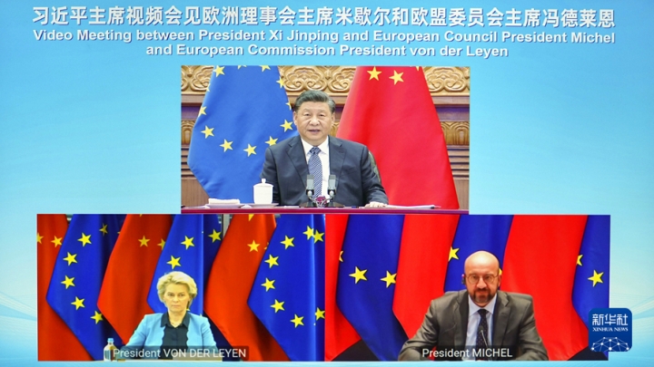 Ĉina prezidanto Xi Jinping renkontiĝis kun prezidanto de la Eŭropa Konsilio Charles Michel kaj prezidanto de la Eŭropa Komisiono Ursula von der Leyen per videoligo vendrede dum la 23a kunveno de gvidantoj de Ĉinio kaj la EU