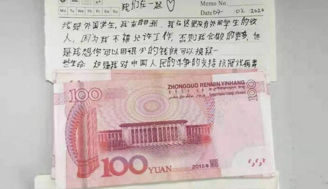 Post eksplodo de la epidemio en la komenco de tiu ĉi jaro, Afo vidis seriozecon de la epidemio kaj maltrankviliĝis, ĉar homoj ne povis eldomiĝi, havis nesufiĉajn manĝaĵojn kaj maskojn. Tial li venis al la loka polica departemento kaj monkontribuis 500 juanojn, esperante, ke tio estas helpema. Fakte tiuj 500 juanoj estas liaj vivtenaj kostoj donitaj de lia patrino. Li ankaŭ lasis la leteron al la polica departemento.