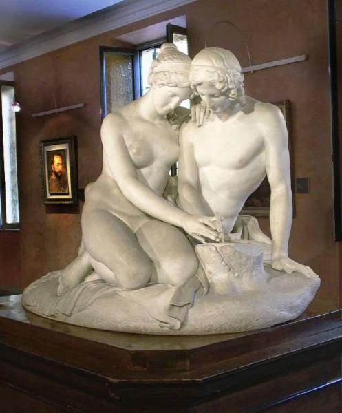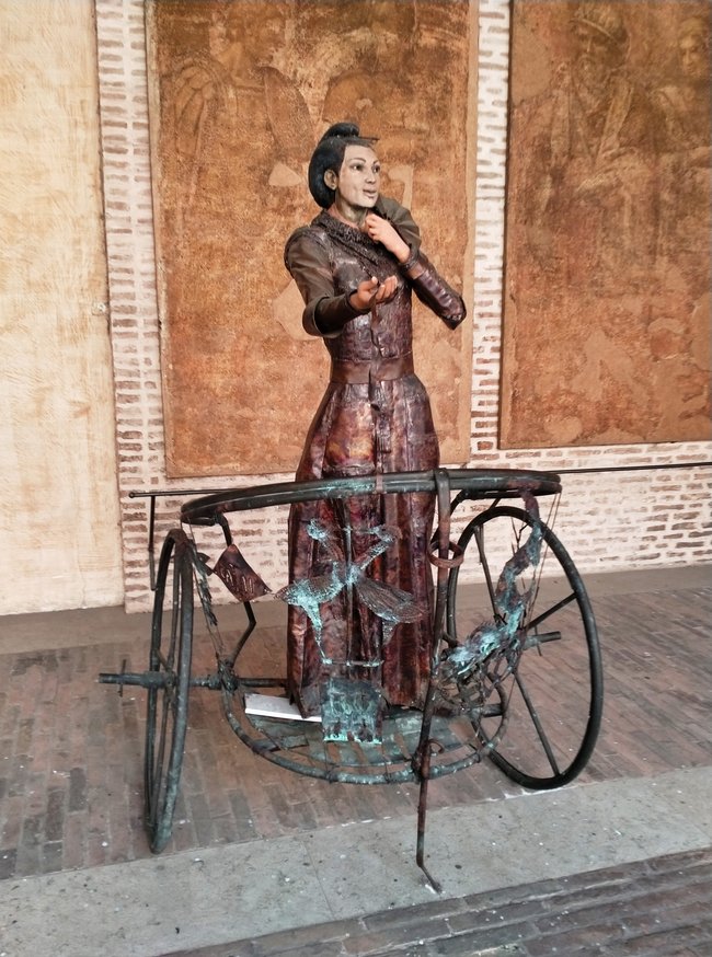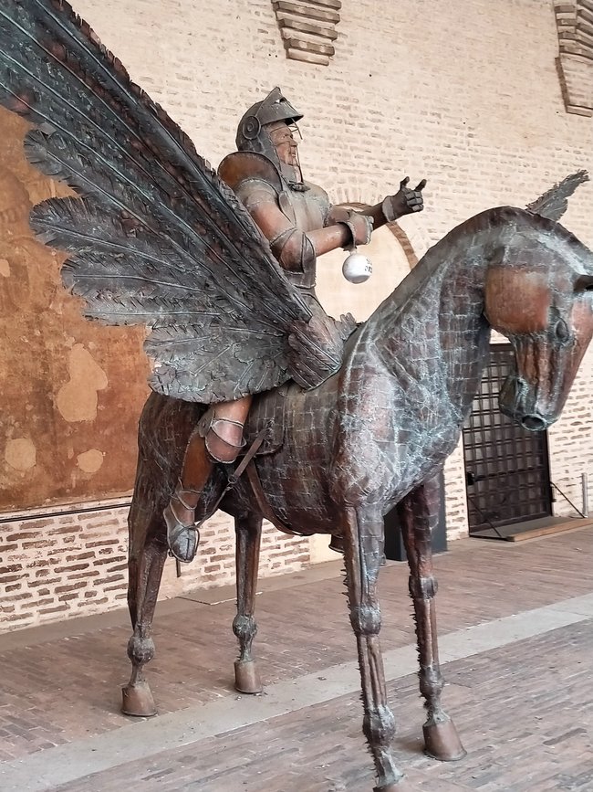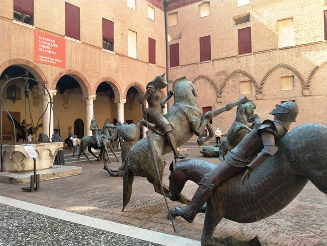 En la ena korto de kastelo Este en la norditala urbo Ferrara, estas nun interesa skulptura ekspozicio nomata “Pri la inoj, la kavaliroj, la bataloj, la amoj” (itale, “Le donne, i cavallier, l’arme, gli amori”). La titolo citas la komencajn vortojn de la poemo FURIOZA ORLANDO (Orlando Furioso) de Ludovico Ariosto (1474-1533), unue publikita tie en 1516. Fakte, Ariosto laboris por la dukoj Este, senjoroj de la urbo, ne nur kiel poeto, sed ankaŭ kiel funkciulo. Interalie, li regis por ili dum kelka tempo la toskanan provincon Garfagnana, najbare al monta kaj mara urbo Massa Carrara, la sidejo de venontjara kongreso de Internacia Ligo de Esperantistaj Instruistoj (ILEI). Inter la skulptaĵoj pri la poemo en la kastela korto, rekoneblas la batalanta heroino Bradamante kaj la angla kavaliro Astolfo sur sia hipogrifo. Li fiere montras grandan botelon, sur kiu estas skribita “La saĝo de Orlando”. Astolfo, fakte, flugis al la Luno por repreni el tie la saĝon, kiun la plej virta kavaliro de imperiestro Karolo la Granda perdis pro sia malfeliĉa amo je la bela Anĝelika. Ŝi estis junulino kun magiaj povoj kaj nerezistebla ĉarmo, filino de la reĝo de Ĉinio, Galafrone. Estas duboj, ĉu la vorto “Catai” signifis tiam ekzakte nuntempan Ĉinion, ĉar ĝi estas priskribita kiel loko “inter Barato kaj Tartario”. Kiel ajn, la statuoj de Sara Bolzani kaj Nicola Zamboni en la korto de la kastelo montras Anĝelika kun ĉin-stilaj vestoj sur batal-ĉaro ornamita je ĉinaj gruoj.