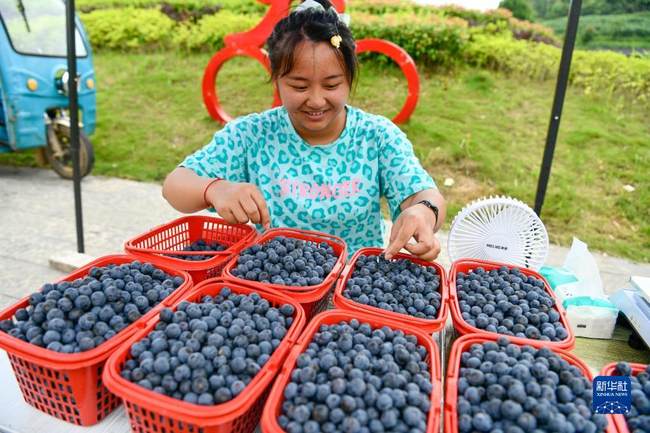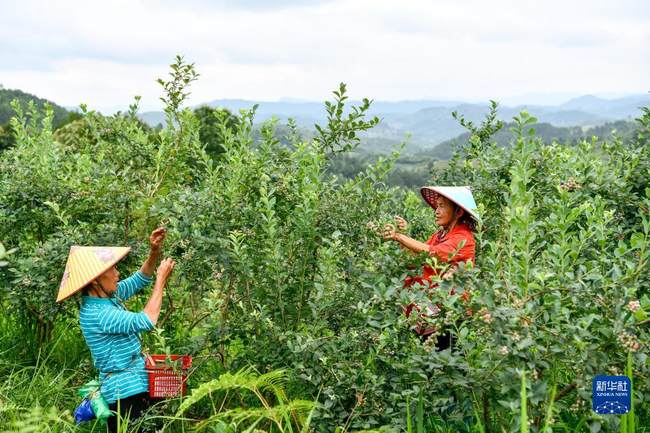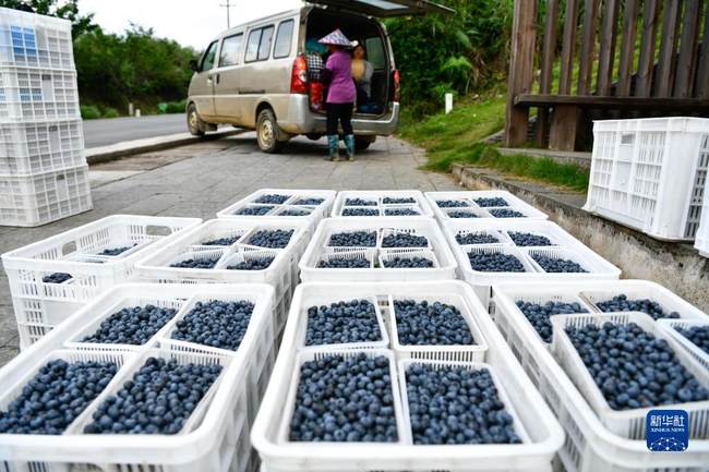 La foto montras rikolton de 80 000 muoj da blubero en Qiandongnan Miao-etna kaj Dong-etna Aŭtonoma Subprovinco de Guizhou-provinco. Ekde 1999 la gubernio Majiang komencis kultivi bluberojn kaj nun ĝi jam estas nacia geografia simbola produkto kaj la ĉefa industrio de la loko. Pli ol 1 100 familioj de kamparanoj riĉiĝis dank’ al la blubera industrio.
