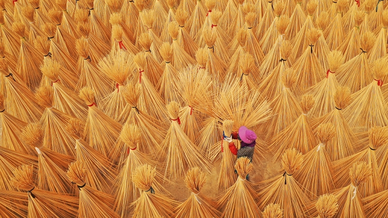 En la urbo Anji, sud-orienta ĉina provinco Jiangxi, kamparanoj sekigis maǔ-bambuojn sub la suno. En la laborado de mildigo de malriĉeco, la loka registaro enkondukis kapitalojn kaj teknologiojn, kaj disvolvis la industrion de prilaborado de maǔ-bambuoj laǔ la loka kondiĉo por riĉigi lokanojn